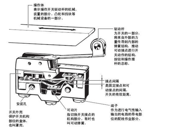 微動(dòng)開(kāi)關(guān)具有微小接點(diǎn)間隔和速動(dòng)機(jī)構(gòu),用規(guī)定的行程和力進(jìn)行開(kāi)關(guān)動(dòng)作的接點(diǎn)機(jī)構(gòu),被外殼覆蓋, 其外部有傳動(dòng)器,且外形較小。下圖為典型的微動(dòng)開(kāi)關(guān)構(gòu)造的一個(gè)示例。
