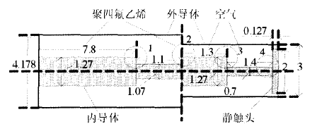 2 . 2 SMA接口及相連同軸結(jié)構(gòu)參數(shù)的提取SMA接口內(nèi)外導(dǎo)體間填充聚四氟乙烯作為絕緣介質(zhì),與SMA接口相連的同軸部分應(yīng)用空氣作