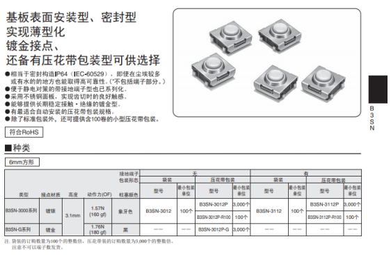 歐姆龍的輕觸開關(guān)普遍應用在電動牙刷,輕觸開關(guān)適合高密度表面貼裝,有的焊接后可清洗,密封型可防塵,最適合惡劣環(huán)境選用,電路設(shè)計簡單。產(chǎn)品壽命10萬~1000萬次不等。