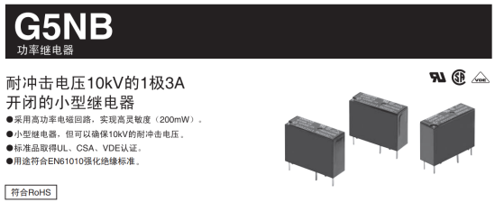 歐姆龍G5NB是一款耐沖擊電壓為10kV的1極3A/5A開閉的小型繼電器,該器件采用了高功率電磁回路,能夠?qū)崿F(xiàn)高達(dá)200mW的靈敏度。并且歐姆龍G5NB繼電器已經(jīng)取得了UL、CSA、VDE認(rèn)證,產(chǎn)品用途符合EN61010強(qiáng)化絕緣標(biāo)準(zhǔn)。