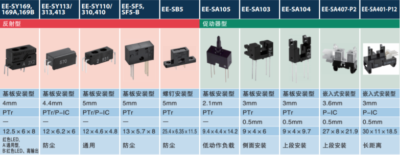 例如在打印機(jī)、智能設(shè)備、工業(yè)機(jī)械等設(shè)備上可以使用EE-SX1088,EE-SX1041,EE-SF5和EE-SX1081,這幾款小體積槽型和對(duì)射式光電開關(guān),驅(qū)動(dòng)功耗低、靈敏度高,輸出電流高低,超小的超寬。