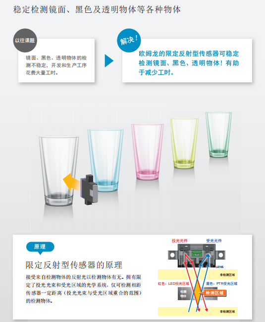 對于玻璃機械來說,歐姆龍檢測有無的光電傳感器B5W-LB2112-1擁有著絕對優(yōu)勢。歐姆龍傳感器抗陽光干擾強,可穩(wěn)定檢測鏡面、黑色、透明物體,接受來自檢測物體的反射光以檢測物體有無,擁有限定了投光光束和受光區(qū)域的光學(xué)系統(tǒng),僅可檢測相距傳感器一定距離(投光光束與受光區(qū)域重合的范圍)的檢測物體。