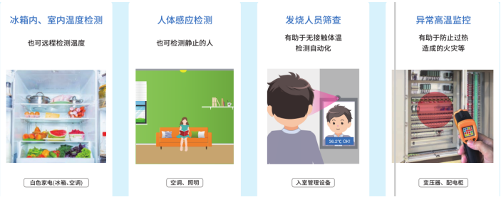 人體檢測(cè):根據(jù)細(xì)微的溫度差和溫度變化進(jìn)行檢測(cè),適用于家電節(jié)能,安防設(shè)備,門禁人體測(cè)溫等;