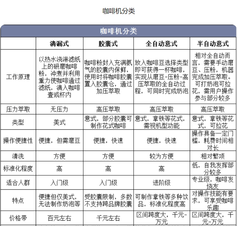 人們把電子技術應用到咖啡機上,實現(xiàn)了磨粉、壓粉、裝粉、沖泡、清除等釀制咖啡全過程的自動控制,創(chuàng)造了咖啡機。具體分品類來看,咖啡機根據萃取方式可主要分為滴漏式、膠囊式和壓力式(意式),根據工作方式可分為全自動和半自動(區(qū)別在于半自動需要消費者掌握一定的咖啡技能,磨豆、壓粉、打奶泡等多項步驟需手動參與)。