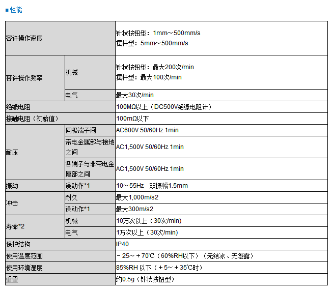 ? ??*1 在針狀按鈕型中為自由位置和動(dòng)作極限位置的值,在擺桿型中為動(dòng)作極限位置的值。接點(diǎn)的閉路或開(kāi)路動(dòng)作小于1ms。 ? ??*2 關(guān)于試驗(yàn)條件請(qǐng)另行查詢。