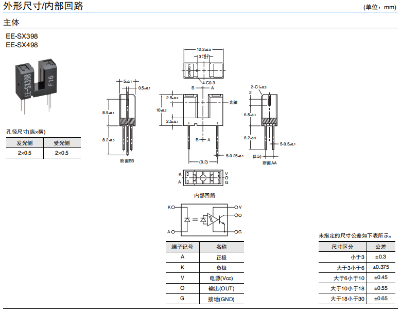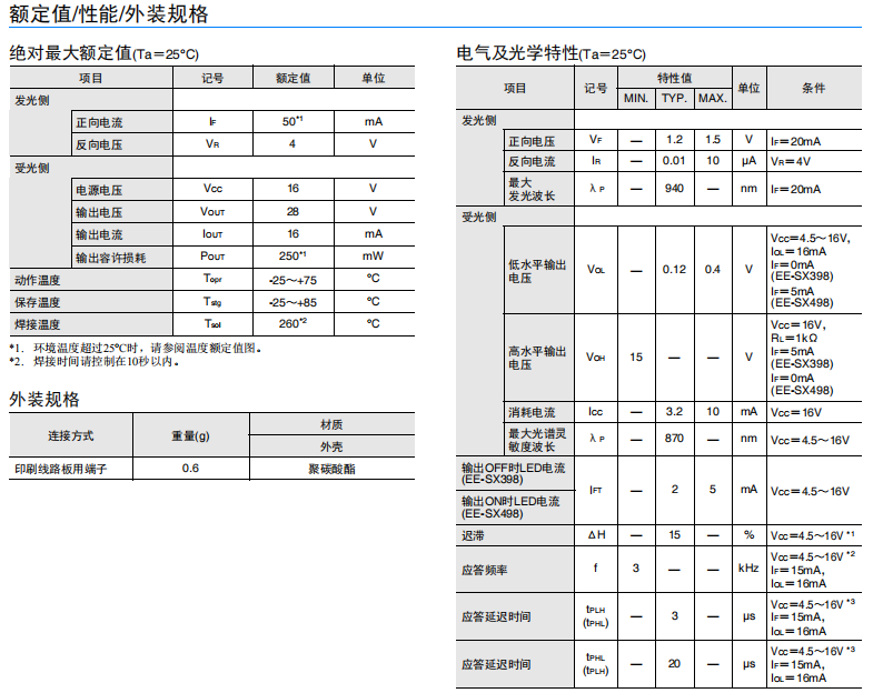 凹槽端子型(槽寬:3mm) ? 光電IC輸出(分為遮光時(shí)ON(EE-SX398)/入光時(shí)ON(EE-SX498) 2種類(lèi)型) ? 適用電源電壓為DC4.5~16V ? 可直接連接C-MOS