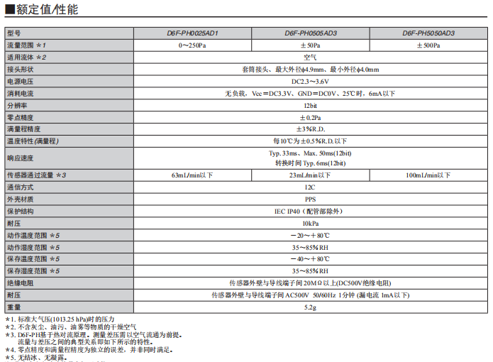 | D6F-PH0505AD3 | -50~+50Pa(±0.2in. H2O) | |