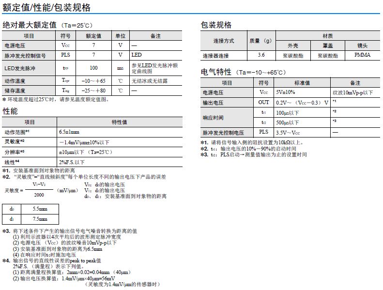 ±10 μm的高分辨率,適用于檢測(cè)紙幣、紙的重疊輸送或偏轉(zhuǎn)量。 利用除法運(yùn)算,檢測(cè)物體顏色等反射率變化的性能好。 標(biāo)準(zhǔn)檢測(cè)距離(動(dòng)作范圍) = ± 6.5 ±1 mm。