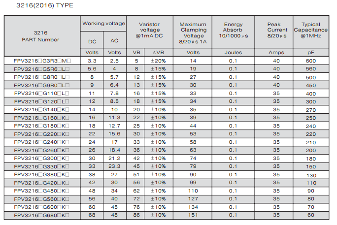 特征: 1、疊層片式陶瓷結(jié)構(gòu)。 2、無引線。 3、溫度范圍:-55℃~+125 ℃。 4、工作電壓范圍V w(dc)=3.3~ 615V。 5、具有雙向限制特性,適合ESD保護(hù)。 6、漏電流非常小。 7、寄生電感小、響應(yīng)速度快(響應(yīng)時間少于0.5ns)。 8、優(yōu)良的溫度系數(shù)。 9、良好的焊接性能(端電極為三層電鍍)。 應(yīng)用: 1、防止過電壓:當(dāng)施加的電壓升高到壓敏電壓時,壓敏電阻器的電流急劇上升,被保護(hù)設(shè)備的浪涌電壓迅速減小,從而使裝有壓敏電阻器的設(shè)備抗浪涌噪聲能力達(dá)到相應(yīng)要求。壓敏