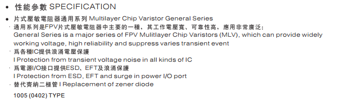 特征: 1、疊層片式陶瓷結(jié)構(gòu)。 2、無引線。 3、溫度范圍:-55℃~+125 ℃。 4、工作電壓范圍V w(dc)=3.3~ 615V。 5、具有雙向限制特性,適合ESD保護。 6、漏電流非常小。 7、寄生電感小、響應(yīng)速度快(響應(yīng)時間少于0.5ns)。 8、優(yōu)良的溫度系數(shù)。 9、良好的焊接性能(端電極為三層電鍍)。 應(yīng)用: 1、防止過電壓:當施加的電壓升高到壓敏電壓時,壓敏電阻器的電流急劇上升,被保護設(shè)備的浪涌電壓迅速減小,從而使裝有壓敏電阻器的設(shè)備抗浪涌噪聲能力達到相應(yīng)要求。